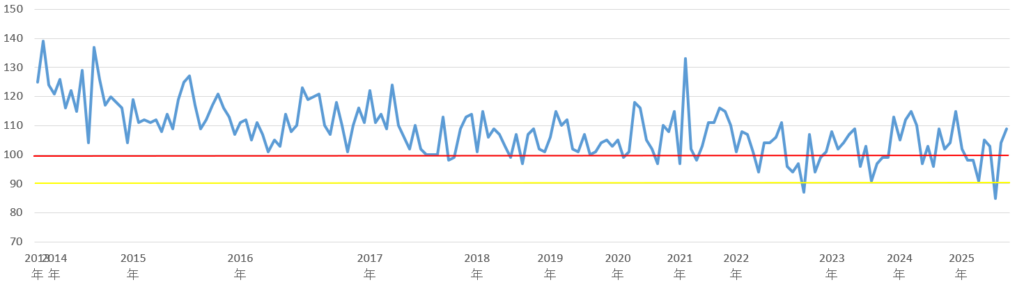 | 2025年 | 9 | 85 | 99.4 ※年間100切り |